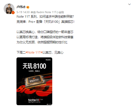 小米集团中国区总裁、Redmi品牌总经理卢伟冰在Redmi K50系列全球首发天玑8100处理器时,曾盛赞天玑8100的表现远超预期。他透露在内部测试中,天玑8100不仅拥有强悍的旗舰性能,更拥有恐怖的超高能效比,不但做到了游戏畅玩并且长时间不热,在天玑8100的加持下,K50系列也迎来更多旗舰体验升级。