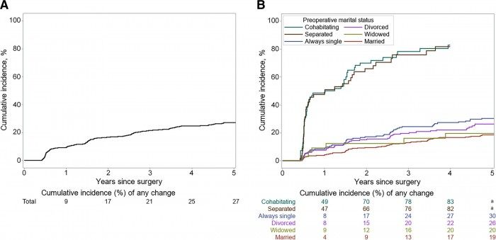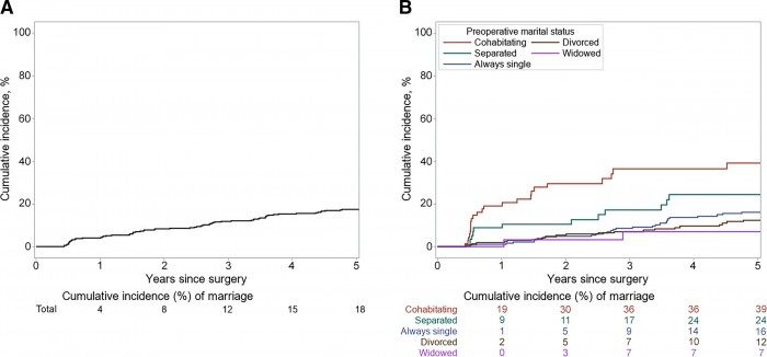 研究配图 1 - 在所有参与者中,术后婚姻状况发生变化的累积发生率。