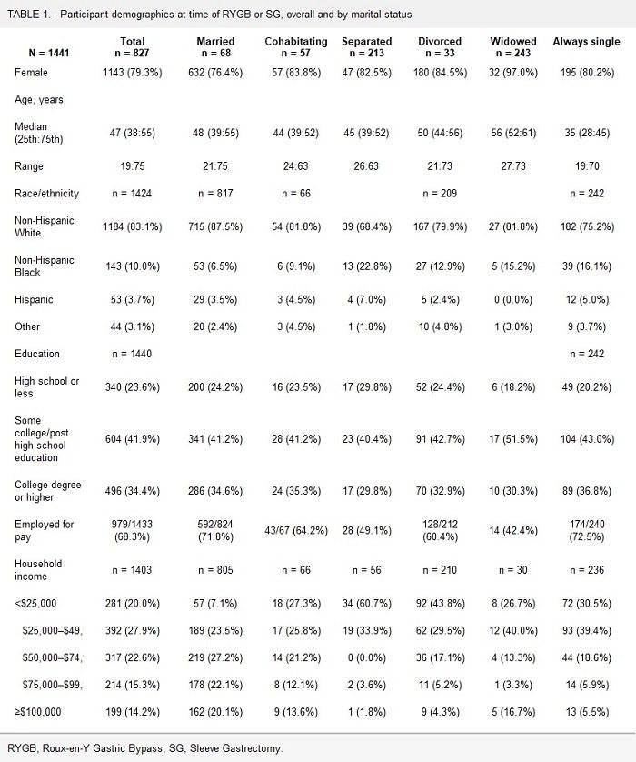 入选者的年龄从 19~75 岁不等,且女性占据了 79% 。结果发现,62% 的患者在接受手术时已婚、或与伴侣同居,其余人则处于分居、离婚、丧偶、或一直单身的状态。