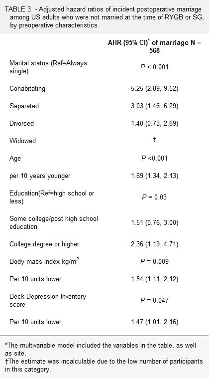 表 3 - 根据术前特征,美国成年人的术后婚姻风险比。