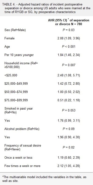 表 4 - 手术时已婚成年人,在术后分居或离婚的风险调整比。