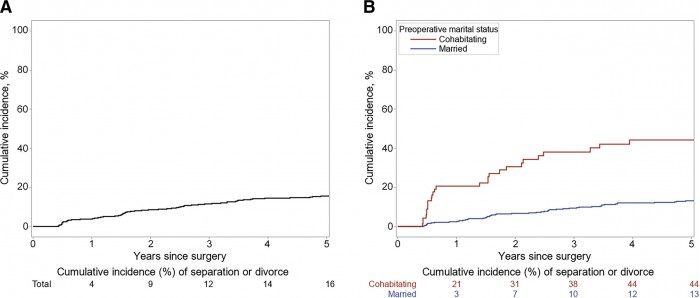研究配图 3 - 在已婚 / 同居参与者中,术后分居或离婚的累积发生率。