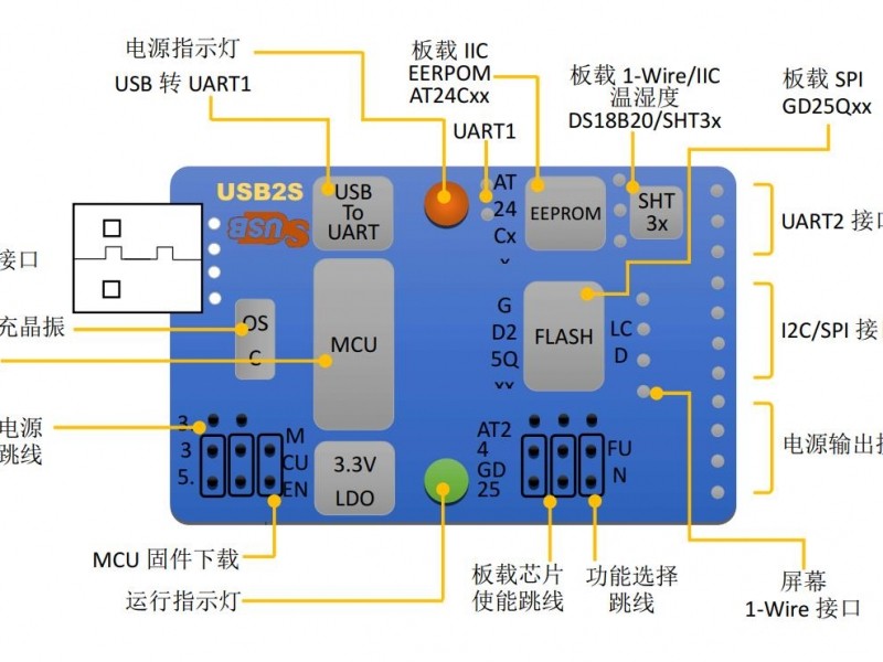 可编程USB转UART/I2C/SMBusS/SPI/CAN/1-Wire适配器USB2S(USB To Serial ports)是多种数字接口物理层协议转发器,广泛应用于电子设备开发测试、工业数字接口转换、数字接口学习验证等领域。