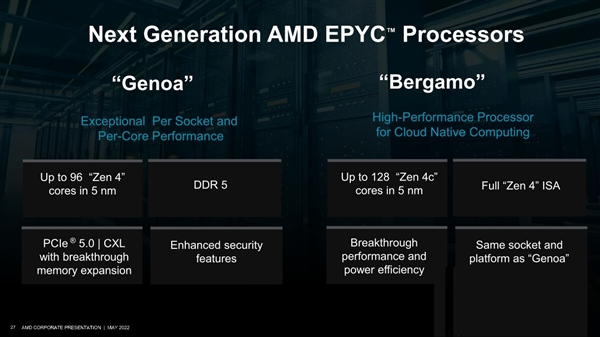 代号Bergamo的EPYC系列则是最多128核256线程,CPU内核是针对高密度计算设计的,架构为zen4c,频率及功耗应该都会更低一些。