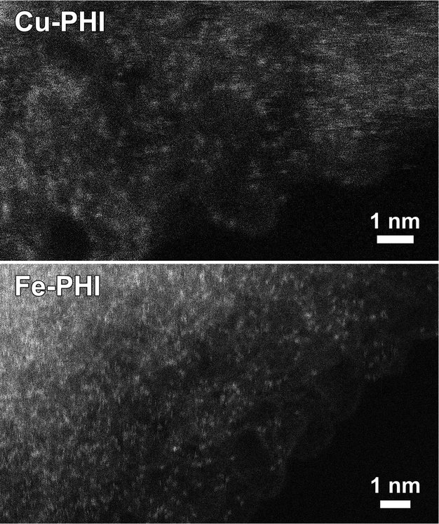 研究配图 2:Cu-PHI / Fe-PHI 电子显微镜图像(亮点为高度分散的金属原子)