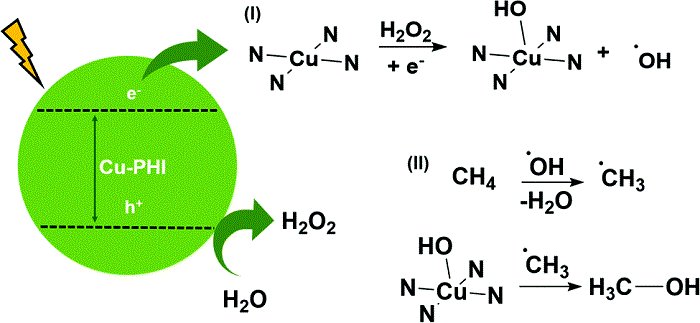 接着他们在以过氧化氢为引发剂的甲烷氧化反应中投入了此类光催化剂,并发现 Cu-PHI 能够产生大量含氧液体产物,尤其是甲醇(四小时内每克材料 2900 微摩尔)。