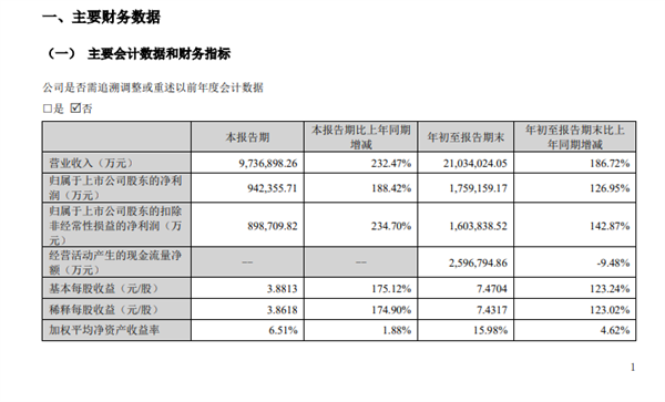 其中,第三季度营收973.69亿元,同比增长232.47%,净利润94.24亿元,同比增长188.42%。