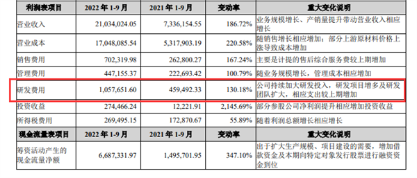 研发上,今年前三季度,宁德时代研发投入105.77亿元,同比增长130.18%,宁德时代表示,公司持续加大研发投入,研发项目增多及研发团队扩大,相应支出较上期增加。