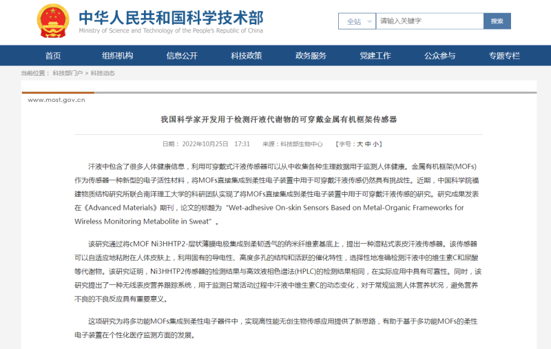 【中国科学院福建物质结构研究所:开发用于检测汗液代谢物的可穿戴金属有机框架传感器】