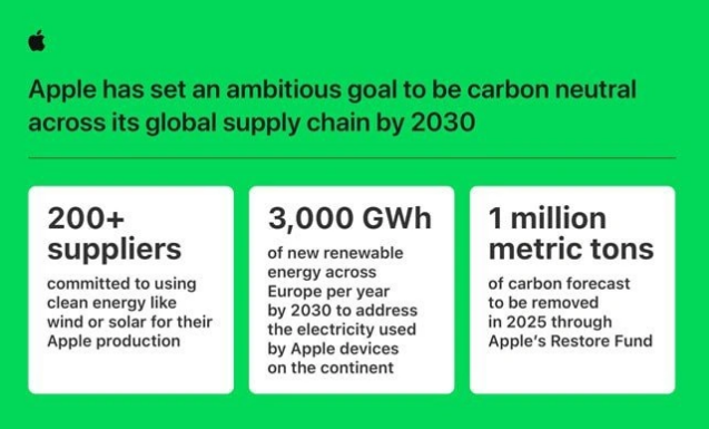 据苹果称,该公司已于 2020 年开始实现全球公司运营碳中和。同时苹果在全球范围内的 200 多家供应商已承诺 100% 使用可再生能源来生产苹果产品,这其中包括了如京东方、立讯精密等在内的 55 家中国供应商。