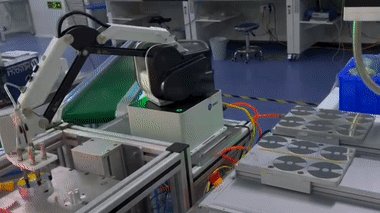 解决方案:MG400 搭配末端吸盘给等离子洗机工位上料,待清洗机清洗完毕后再下料至传送带,流转下一道工序。项目采用双工位设计,每个工位 6 块铝片,实现上下料、清洗同步作业。