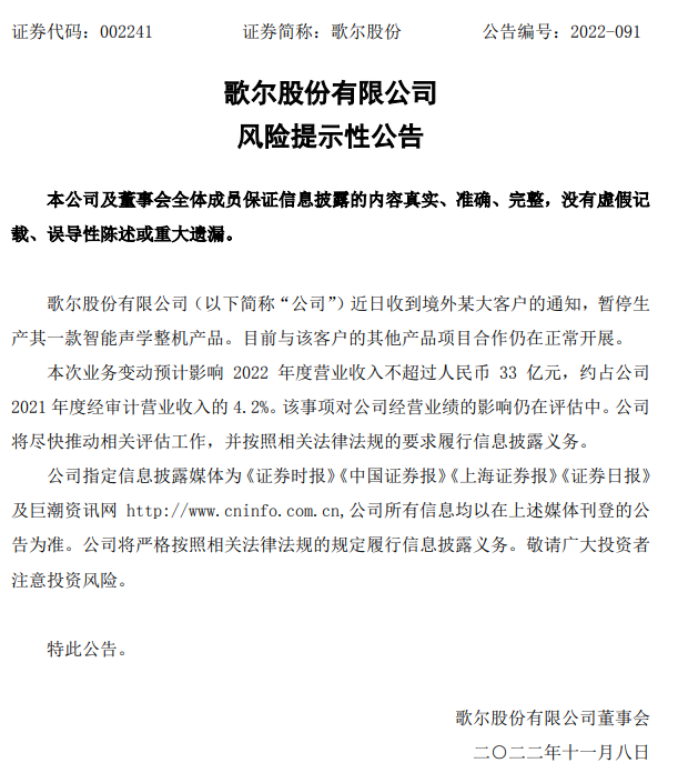 近日,歌尔股份收到境外某大客户“暂停产生一款智能声学整机产品”的通知。歌尔股份发布公告称,预计影响公司2022年度营业收入不超过33亿元,约占公司2021年度经审计营业收入的4.2%。2022年前三季度智能声学整机业务营收198.9亿元,占公司前三季度总营收741.5亿元的约26.8%。