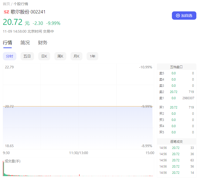 自11月9日,歌尔股份的股价20.72元/股,总市值708.71亿元。