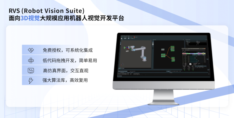 基于方便客户高效开发手眼协调应用、摆脱现有高技术门槛的局限,图漾在2022年5月份正式发布了RVS机器视觉开发平台,基于内置大量3D/2D算法封装,提供更简化的组件化开发模式,以大幅降低项目开发难度,进一步推动3D视觉大规模普及应用。