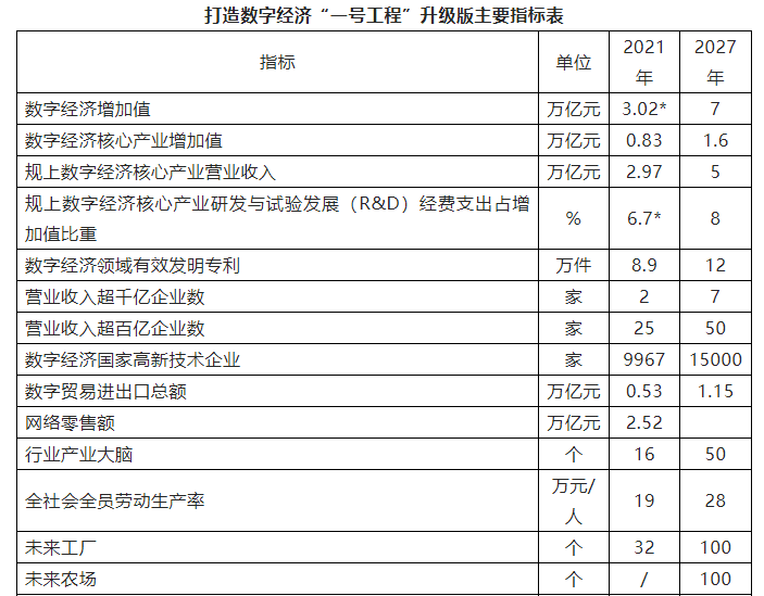 2.发展目标。到2027年,我省数字经济发展达到世界先进水平,数字经济增加值和核心产业增加值分别突破7万亿元和1.6万亿元,实现新一轮“双倍增”,产业数字化和治理数字化水平持续领跑全国,数据价值化、数字普惠化率先取得突破,全面建成全国数字产业化发展引领区、全国产业数字化转型示范区、全国数字经济体制机制创新先导区和具有全球影响力的数字科技创新中心、具有全球影响力的新兴金融中心、全球数字贸易中心,基本建成全球数字变革高地,迈进数字文明新时代。