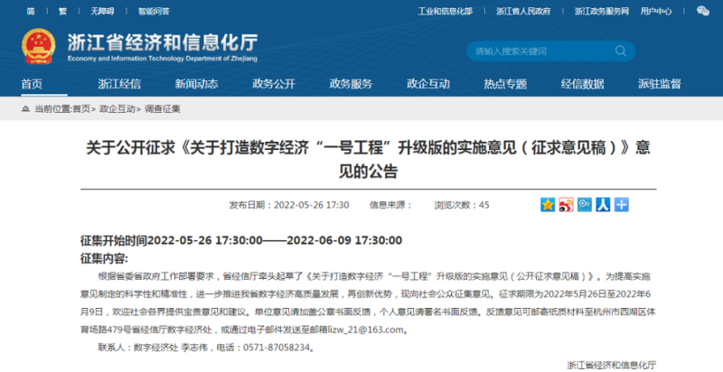 根据省委省政府工作部署要求,省经信厅牵头起草了《关于打造数字经济“一号工程”升级版的实施意见(公开征求意见稿)》。为提高实施意见制定的科学性和精准性,进一步推进我省数字经济高质量发展,再创新优势,现向社会公众征集意见。征求期限为2022年5月26日至2022年6月9日,欢迎社会各界提供宝贵意见和建议。单位意见请加盖公章书面反馈,个人意见请署名书面反馈。反馈意见可邮寄纸质材料至杭州市西湖区体育场路479号省经信厅数字经济处,或通过电子邮件发送至邮箱lizw_21@163.com。