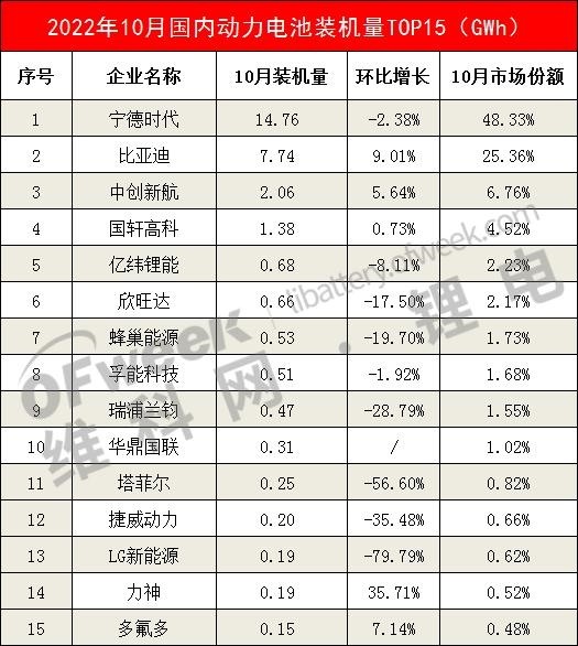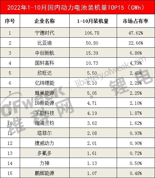 1-10月国内动力电池装机量TOP15的企业分别是:宁德时代、比亚迪、中创新航、国轩高科、欣旺达、亿纬锂能、蜂巢能源、LG新能源、孚能科技、瑞浦兰钧、塔菲尔、捷威动力、多氟多、力神、鹏辉能源。