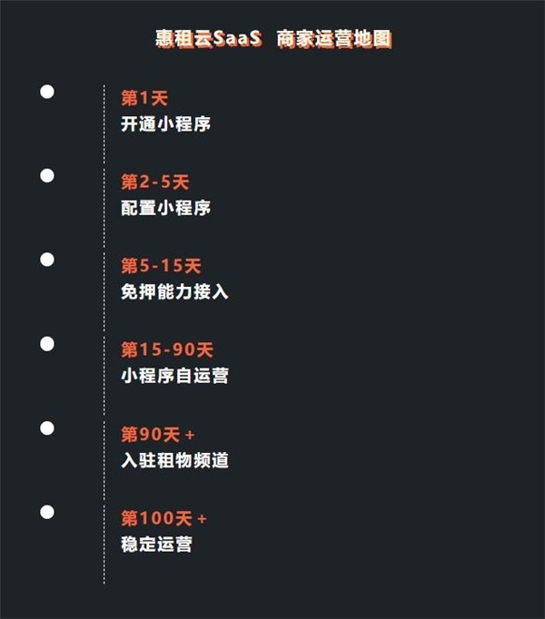 使用惠租云SaaS服务,我们清晰的商家运营地图,助力商家90天入驻租物平台,享受支付宝公域流量及优质订单客户。