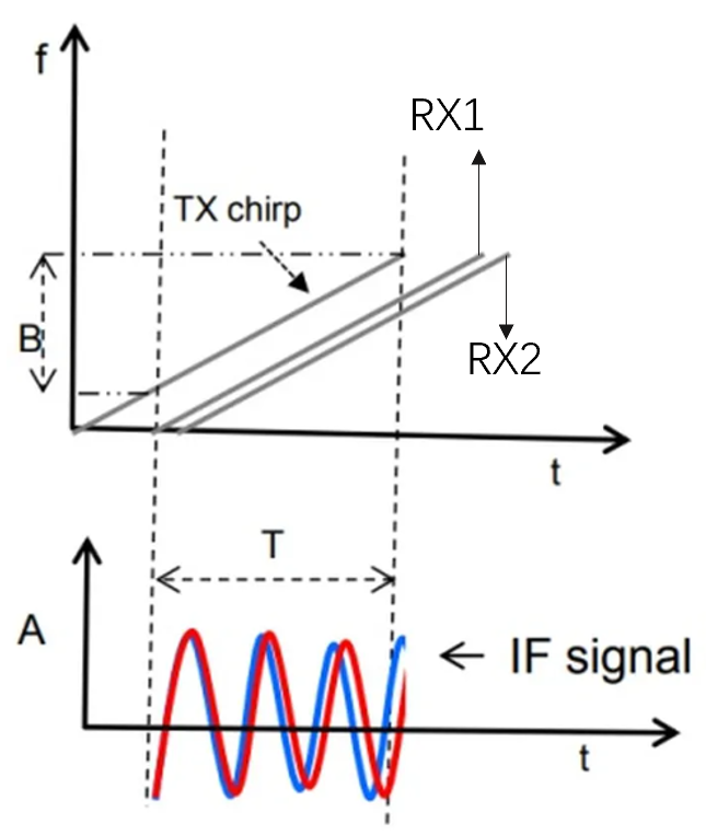 假设了两个相距很近的目标,被雷达探测到,两个回波信号和发射波形混频后就得到了两个中频信号,这两个中频信号的时间T相差很小,因此中频信号的频率相差很小。