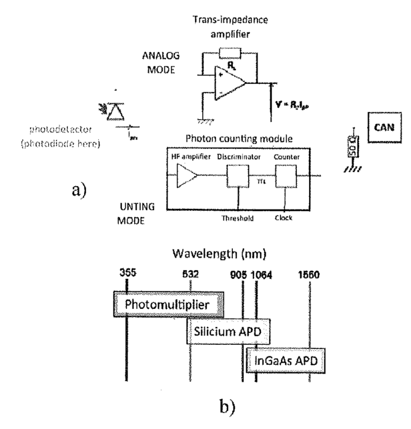 | Photodetector | 将反射回来的光信号转化为易测量的电信号 | 需要放大器放大信号,避免在ADC转化过程中信号淹没在量化噪声中会影响LiDAR的空间分辨率 |