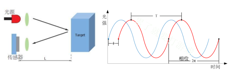 相位测距是将发射的连续的激光进行幅度调制(调制光的光强随时间做周期性变化),被测量物体发射后,激光产生相位变化。根据相位差可以间接的测量时间和距离,比dTOF直接测量时间所需的器件要求有所降低,信号处理难度也降低了很多。