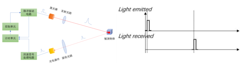 dTOF(direct Time-of-Flight)测距的核心原理是激光器对被测物体发射一束时间极短的激光,通过直接测量激光发出,达到被测物体再返回到光电探测器的飞行时间,来计算被测物体的距离。