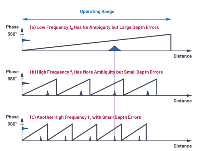 低频调制对应于远距离的测量,但是精度较差;而对于高频调制对应于近距离测量,精度较好。因此,高低频复用既可以用于探测远距离,也可以得到较好精度。如下图所示,可以使用几个不同的调制频率去确认哪个距离才是真实的距离,这种方法低调制频率的部分可以提供无歧义的距离估计,而高调制频率的部分可以提供更高的精度,兼顾了测量距离和测量精度的需求。