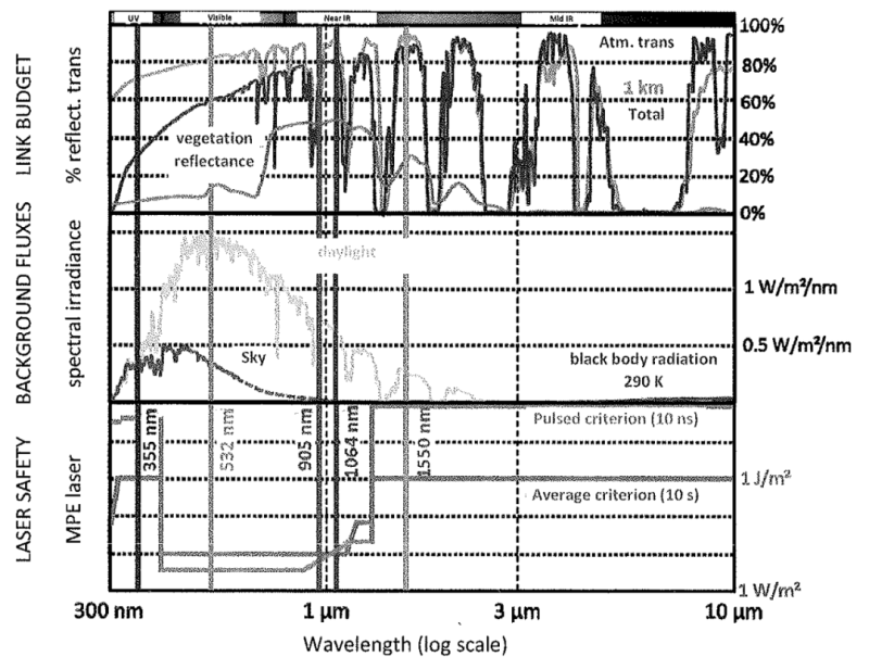 在LiDAR使用过程中,太阳光或者其他热辐射也会直接或通过散射进入激光检测器,形成背景噪声。环境热辐射在近红外区的占比很低,因此1550nm的激光器受背景噪声的干扰最小。