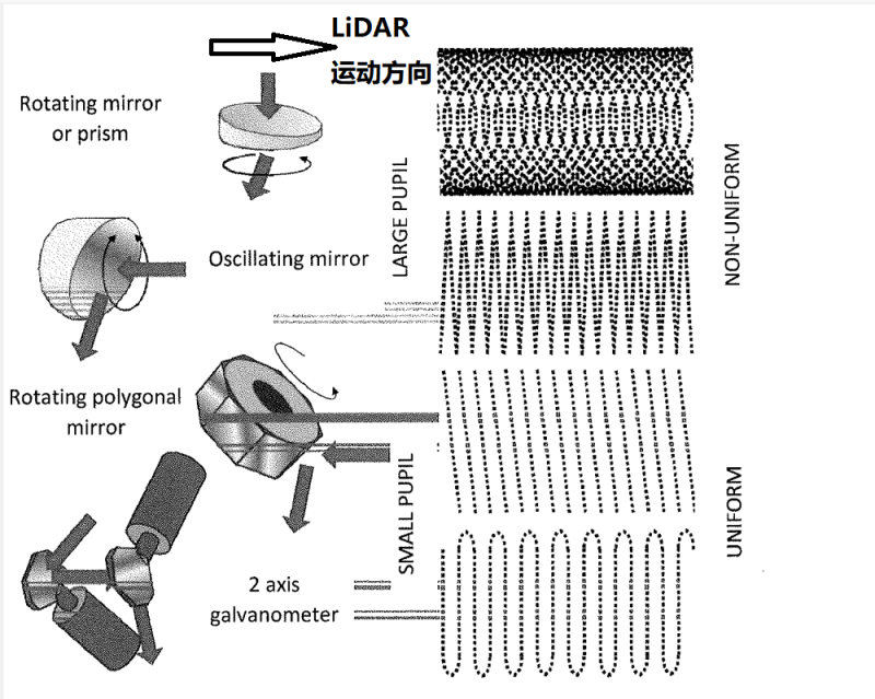为了对大范围区域进行迅速的激光扫描,通常需要使用旋转机构来改变激光的测量方向。最终得到的点云密度和旋转机构的旋转速度以及激光器的repetition frequency有关。