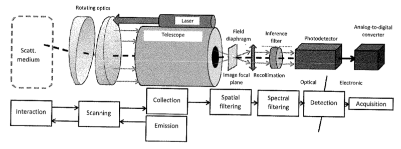 LiDAR(light detection and ranging)激光雷达是一种非接触式探测和测距方法。该技术通过发射光脉冲击中附近物体后测量反射回波信号的特性来精确地计算每个物体的距离。它是由以下部件组成的传感器系统;激光器(laser)发出特定波长的激光,经过旋转机构(scanning)实现区域的快速扫描,反射回来的激光经过滤光片(spatial & spectral filter)滤除环境干扰,最终通过光电检测器(photodetector)将光信号转换成易测量的电信号进行检测。