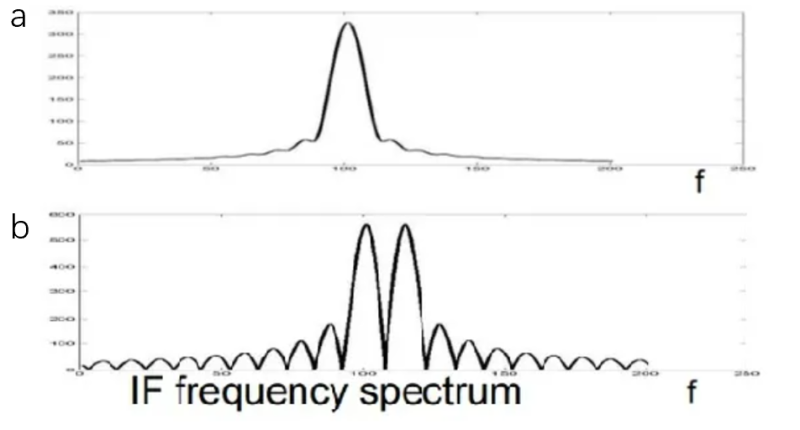 通过傅里叶变换可以将时域信号转换为频率信号,从而得到中频信号的频率。如下图a所示,如果LiDAR的频率分辨率较差,即两个目标的频率信息难以分辨,则无法分辨两个相近的目标;如下图b所示,如果有能力分辨两个物体,则可在频率信息中看到两个分离的频率峰。