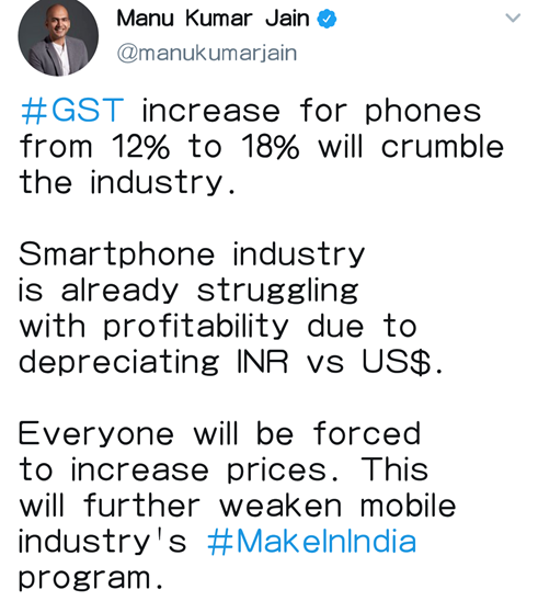 小米印度总经理蛮牛曾在推特上直接表示GST税率上调“对智能手机行业是毁灭性的”,本来卢比对美元贬值,已经使得智能手机行业利润微薄,迫使手机厂商涨价,GST税率上调将进一步削弱智能手机的印度制造计划。
