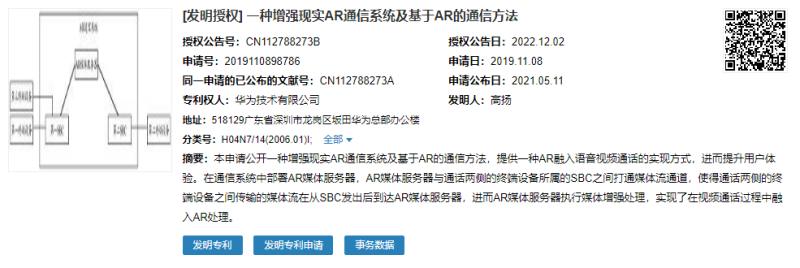 IT之家 12 月 2 日消息,据国家知识产权局中国专利公布公告(授权公告号:CN112788273B)显示华为技术有限公司申请的“一种增强现实 AR 通信系统及基于 AR 的通信方法”专利获授权。