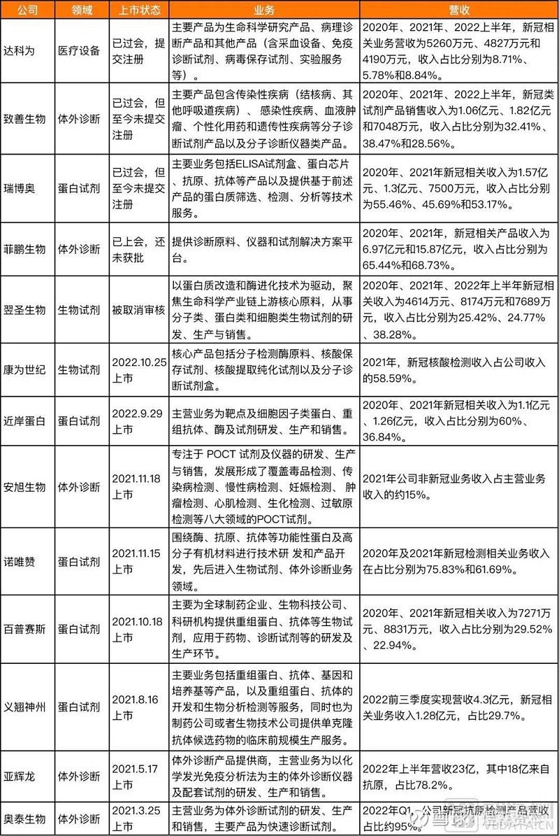 那么,“涉核酸检测企业”是不是都靠新冠赚到盆满钵满?小编整理了疫情以来,一些在创业板和科创板上市/待上市的“涉核酸检测企业”的主营业务,与营收中的新冠业务占比情况: