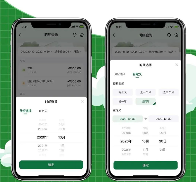 默认展示近两年的交易明细,可通过顶部筛选栏选择查询时间,可按月查询、选择快捷查询时间或自定义查询时间(起止日期间隔不超过两年)