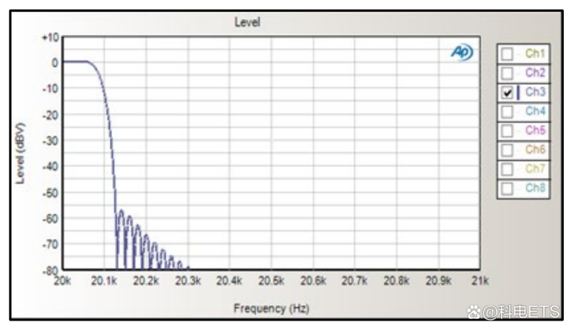 第二个推荐的滤波级是分析仪中的锐滚降带宽限制滤波器。AES17标准建议使用这种滤波器进行D/A转换器测量,这种建议的内置滤波器对于D类功放测量来说是个良好的选择。Audio Precision在APx分析仪中用矩形DSP滤波器来实现。