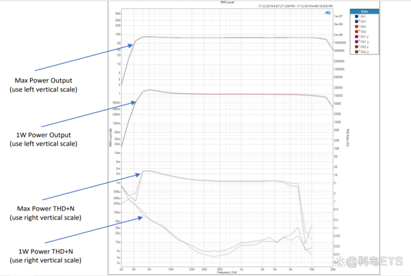 我们可以看到,输出功率曲线在功率电平之间是一致的,但THD+N曲线有明显不同。另外,两条THD+N曲线在约6kHz处急剧下降,这表明当谐波超过带宽限值时,该测量值减小。