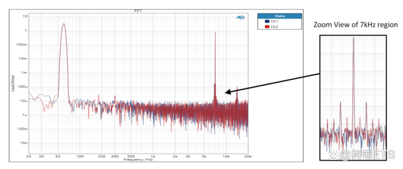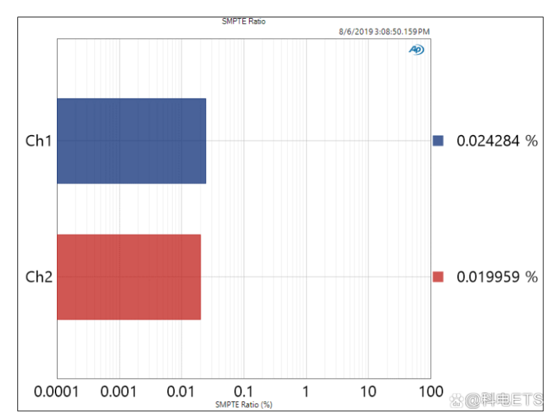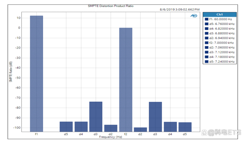 有反应的谐波现在位于7kHz音调附近。在120Hz、180Hz等频率下看到的60Hz音调的任何谐波与本试验无关。然后,SMPTE IMD被确定为IMD产品的均方根值水平,表示为f2均方根水平的比值。以下是SMPTE IMD测试结果的表示: