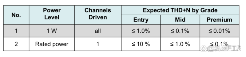 测试音频放大器时,通常进行两次THD+N测量。第一次是在1W输出功率下完成,所有通道同时驱动。这重点关注整个放大器的小信号失真。另一次是全功率测试,只有一个通道被驱动。这验证了DUT可以达到预期的最大功率设计目标,同时满足失真性能设计目标。当放大器的功率从1W输出参考电平增加到最大额定功率输出时,THD+N百分比可以增加10倍或更多。以下是目标THD+N性能规格与设备等级的对比示例——