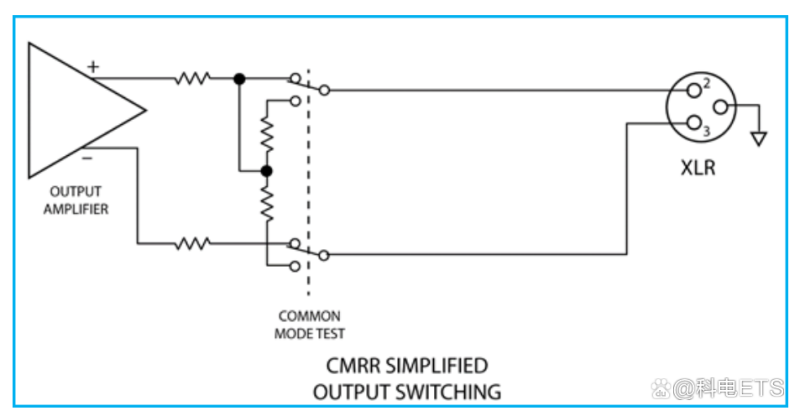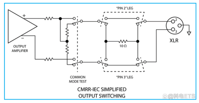 IEC 60268-3标准为共模抑制比测试定义了略微不同的实施方式。首先测量差分信号并存储其值。接下来,按照IEC 60268-3标准所规定的,将每个输出支路以共模输出的模式分别测量,并且每个支路与10欧姆源电阻串联。两个输出的较高测量共模电平被用作共模值,最后,进行计算。