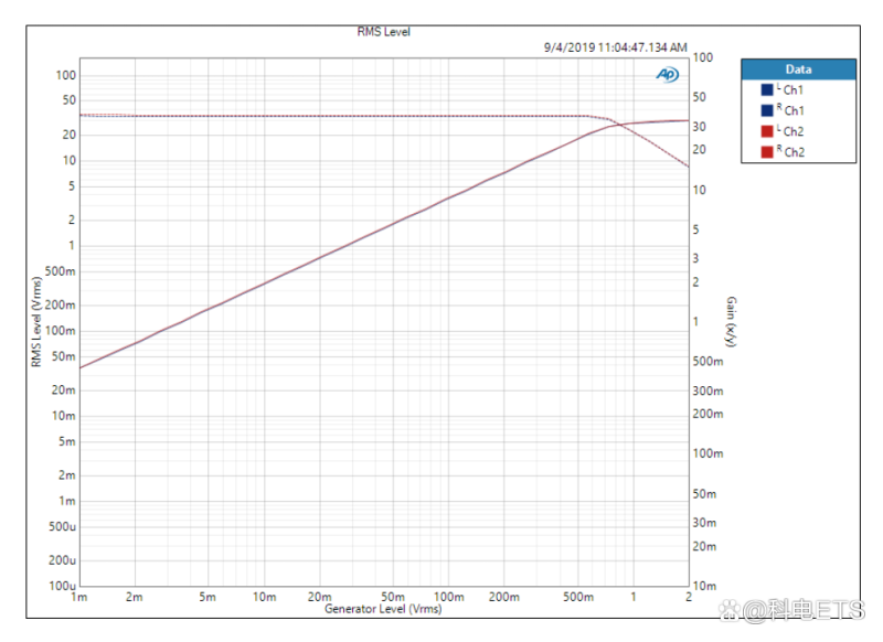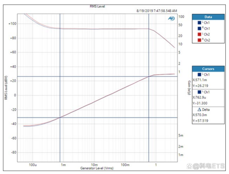 在两个通道上测量输出电平和增益的同时,通过应用阶跃输入电平扫描,可以方便地执行增益和电平测试。如下图所示,该放大器的增益约35,并具有线性响应,输入振幅(图上的水平刻度)从低于2mVrms到约600mVrms,然后开始在输出处削波。左轴显示以Vrms为单位的测量输出电平。注意,该DUT的左通道和右通道非常匹配。