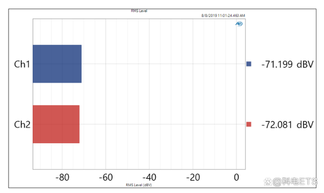 使用音频分析仪测试直流偏置的过程相对简单。连接负载后,功放开启,DC level用于测量直流电平。这里不用施加AC信号到放大器输入端。下图显示了该测试结果: