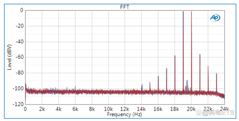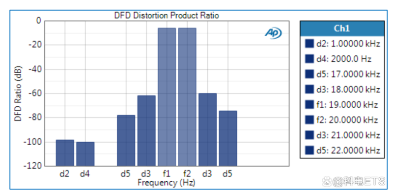 差频失真(DFD)是在IEC 60268-3规范中标准化的高频双音IMD测试的一个示例。DFD测试适用于AB类和D类放大器。该测试通常作为设计和开发周期的一部分进行,但通常不作为验证或生产测试的一部分。以下是DFD测试的示例输出。在这种情况下,施加到DUT的两个等幅度音调是19kHz和20kHz。通过计算交互谐波振幅之和与所施加的两个基音振幅之和的比率来进行分析。在该比率中仅考虑2nd和3rd交互产物——