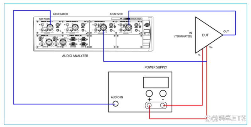 下面就是以IEC 60268-3标准规定的测试电路,同样是在提供两个信道发生器的音频分析仪中实现。