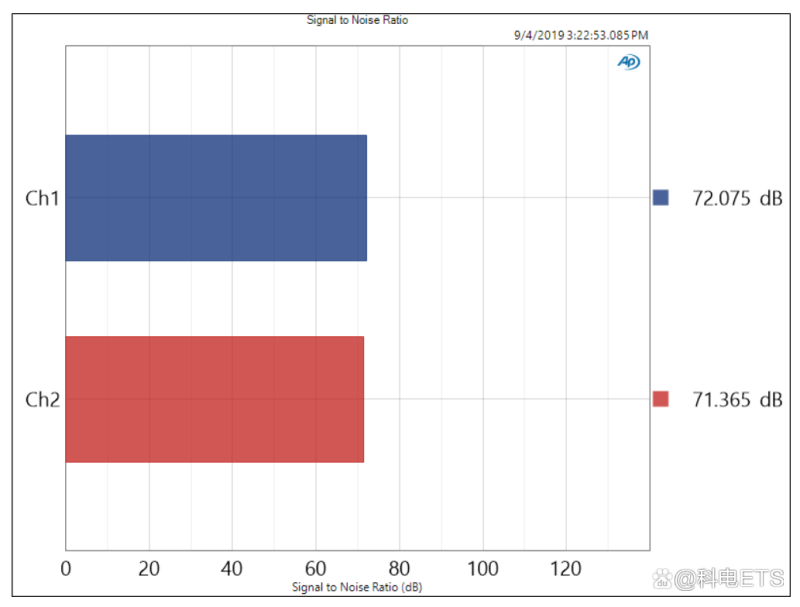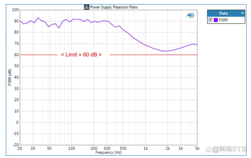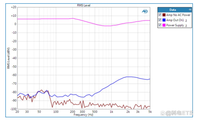 该图表明,DUT明显满足以下测试极限:在20Hz至5kHz范围内≥60dB。还请注意,由于在20Hz至约70Hz的范围内,“Amp Out Ch1”等级不高于“Amp No AC Power”,因此我们只能说DUT的性能与展示出来的性能相当或更好。理想情况下,电源AC电压将足够高,达到高峰能使DUT输出达到峰值频率,但这几乎不可能。