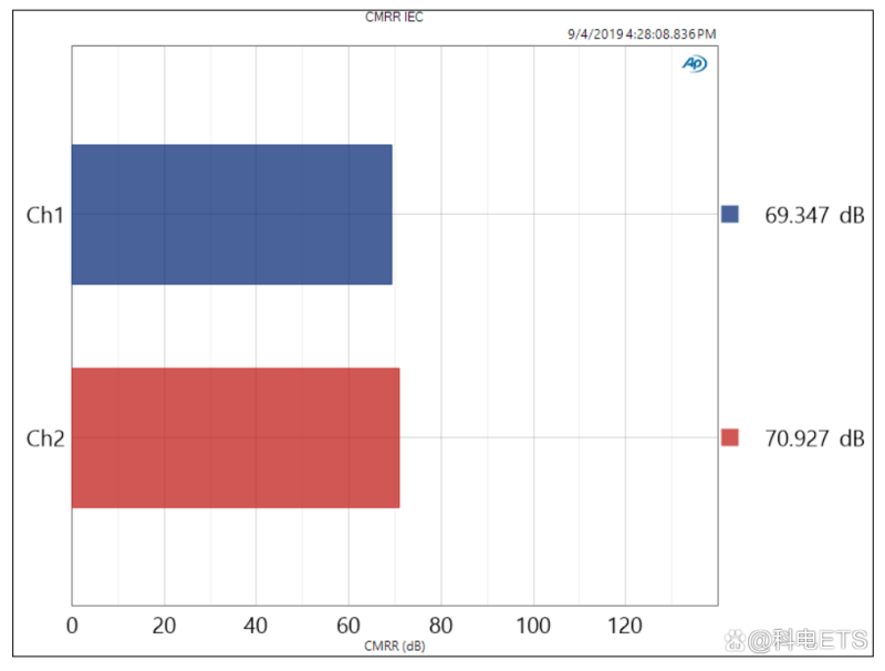 对于设计良好的功放,这些共模抑制比测试结果通常在60dB或更大范围内。可以看到,IEC共模抑制比方法比基本共模抑制比略微差一点。APx500音频分析仪(B系列)用于这些共模抑制比测试,可从可用测量值列表中选择。