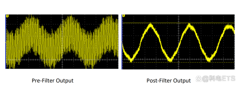 幸运的是,这种情况有一个可靠的解决方案。通过对输出端进行滤波,可以在高频成分到达分析仪前对其进行滤波,从而显著减少高频成分。建议滤波分两个阶段进行。第一阶段是连接在功放输出和分析仪输入之间的外部无源滤波器。这能在信号到达分析仪之前消除了大部分高频成分。以下信号捕获显示了D类放大器的前滤波和后滤波信号——