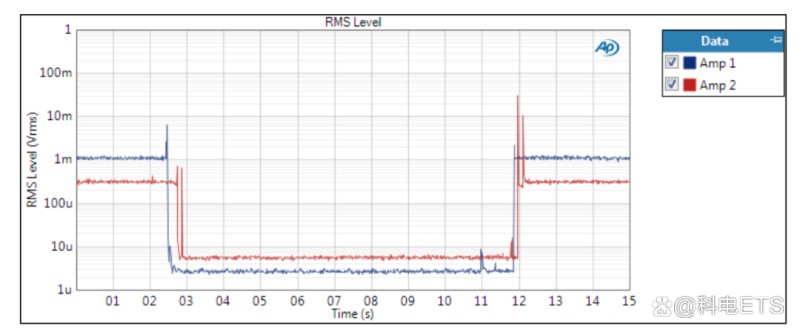将音频分析仪连接到适当加载的音频放大器的输出端并获取一个信号相对容易,该信号演示了信号中的尖峰是在开启还是关闭时出现的。以下是使用APx500分析仪中的测量记录仪进行此类采集的示例,该记录仪显示了在测试的开启和关闭部分发生的瞬态峰值——