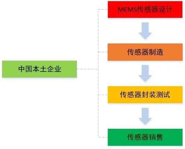 由于中国MEMS行业起步较晚,研发、设计和工艺积累薄弱,多数中国本土企业缺乏自主化能力,因此采用外购芯片封测模式为主。