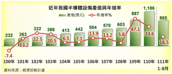 根据工研院产科所引用SEMI统计近10年(2020~2021年)数据显示,除了2011、2015年之外,其他每年设备市场规模皆可达到百亿美元以上,2019年甚至比起2018年成长达到68%。主因即是当时业者正积极投资开发7nm、10nm等先进制程,对于半导体设备的市场规模都会产生正向影响。促使中国台湾半导体设备产值自2012年之后就逐年成长,近10年来平均年增17.7%;在2021年突破千亿元,达到1,186亿元之后,还较前年大增33.6%,可望连续两年突破千亿规模。